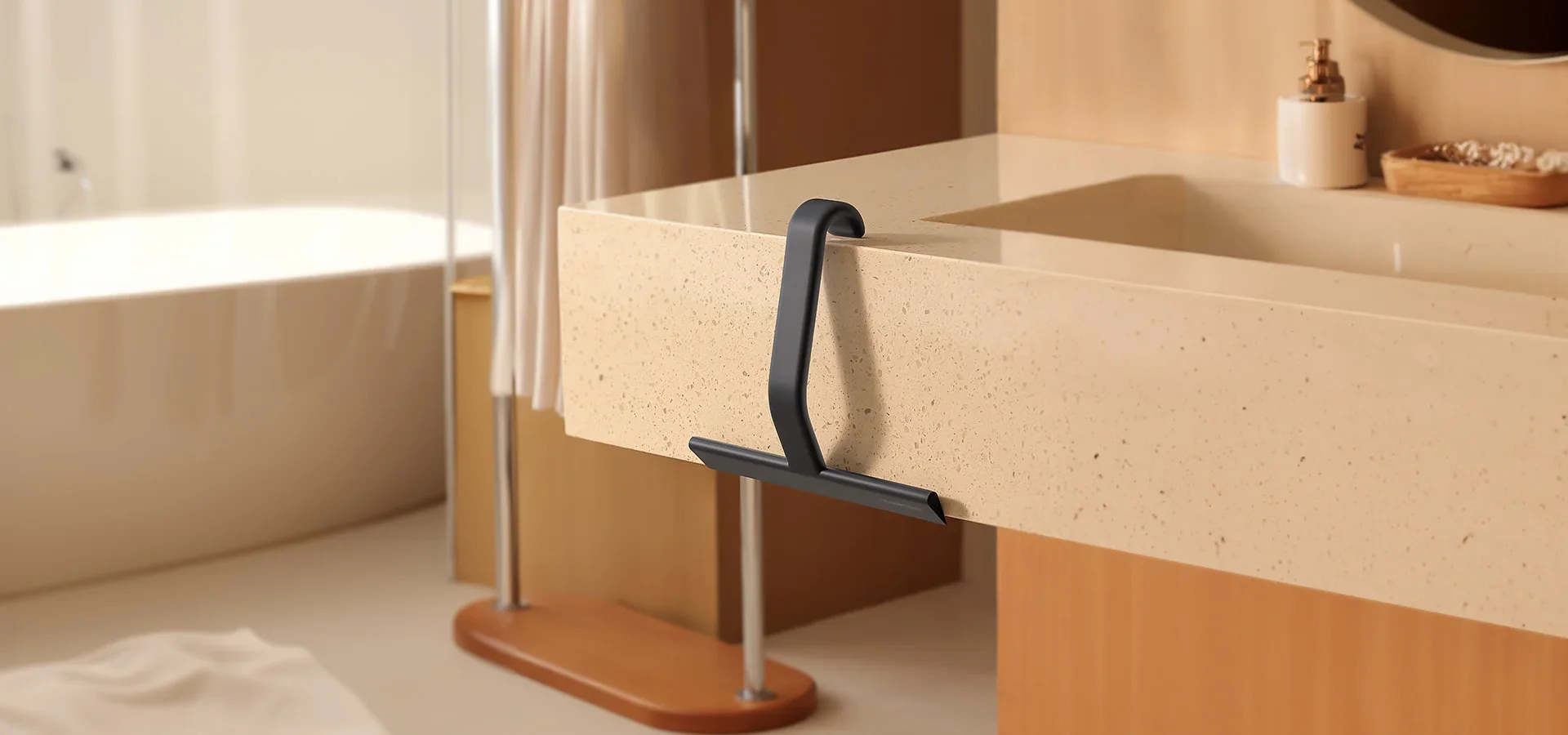 Yes, the versatile built-in hook lets you hang it wherever you choose—on shower doors/walls, showerheads, caddies, door handles, towel bars, rods, sink edges, and other bathroom setups.